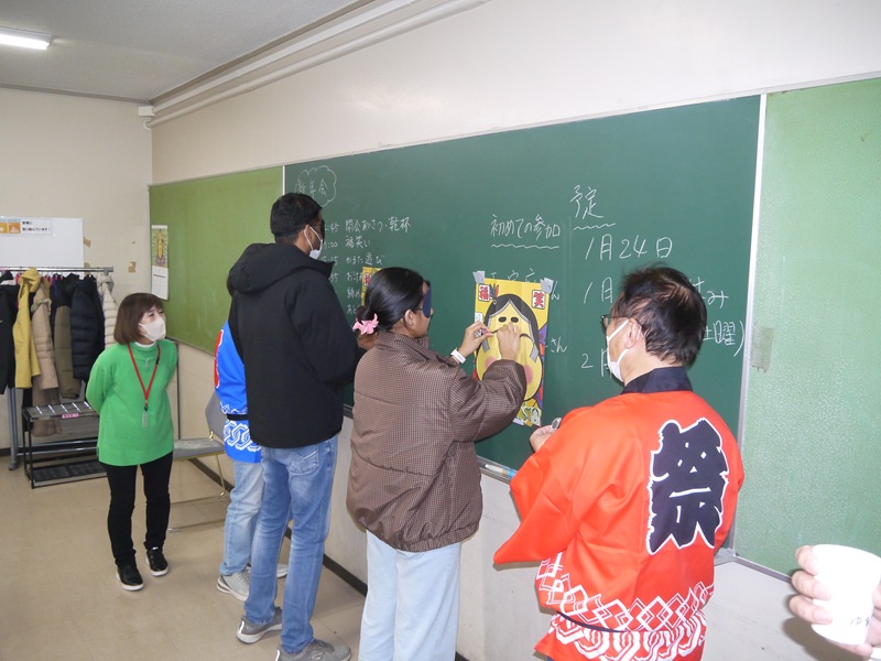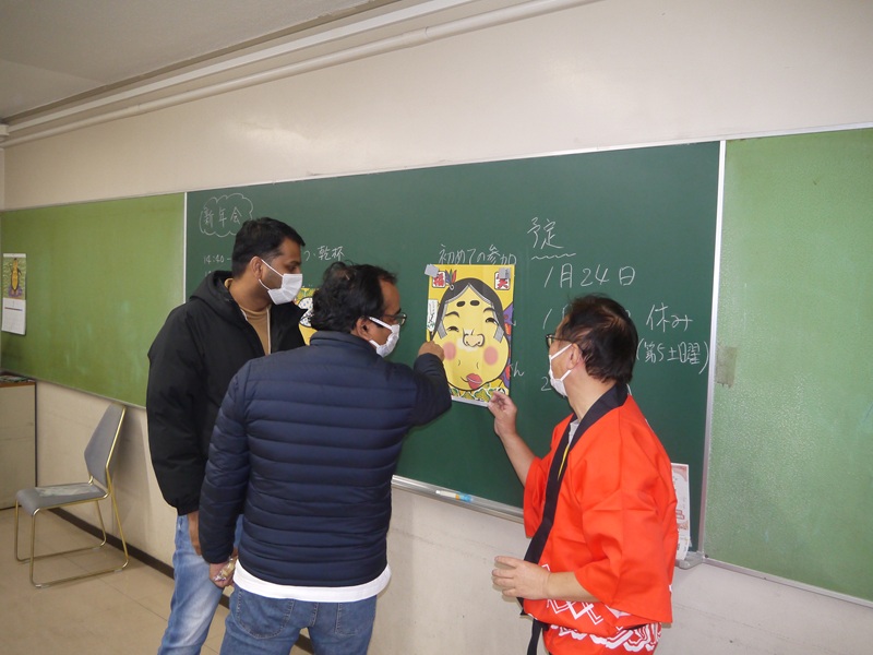 昨年に続き本年も新年祝賀会を行いました。福笑いやカルタなどで日本のお正月遊びをしました。ビール、甘いお汁粉も振舞われ、皆で新年を祝いました。途中で中国人の生徒さんが韓国語と日本語で日本の歌を歌ったりするなどして楽しいひと時を皆で過ごしました。